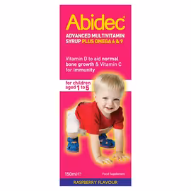 Abidec is a trusted UK children's multivitamin brand, specially formulated to support healthy growth and development from birth to 12 years. The drops contain 7 essential vitamins including Vitamin D for bone development, Vitamin C for immune health, and Vitamin A for normal growth. Given daily, Abidec helps provide the correct balance of vitamins for your child's healthy development. The easy-to-use liquid formula comes with a syringe for accurate dosing - 0.3ml for babies under 1 year and 0.6ml for children 1-12 years. Manufactured by Omega Pharma Ltd in Devon, Abidec is available in two formats: classic Multivitamin Drops (25ml) and Advanced Multivitamin Syrup with added Omega 6 & 9 for children 1-5 years. The brand is stocked at all major UK pharmacies and supermarkets including Boots, Tesco, Morrisons and Sainsbury's. Compare Abidec vitamin prices at Grocefully to find the best supermarket deals.