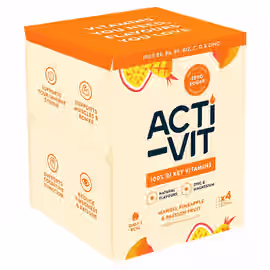Acti-Vit is a UK sparkling vitamin water brand launched by Actiph, the Edinburgh-based alkaline water company. Designed for everyday wellness, Acti-Vit offers a functional drink with one of the highest vitamin concentrations on the market. Each can contains 100% of your recommended daily allowance of Vitamins B5, B6, B9, B12, C, D and Zinc, plus 15% RDA of Magnesium. With zero sugar, no caffeine, and only 3 calories per can, Acti-Vit provides a health-conscious alternative to sugary soft drinks. The brand targets those seeking drinks that combat tiredness and fatigue, promote healthy hair, skin and nails, support healthy muscles and bones, and boost immune health. Flavours include Blackcurrant, Apple and Raspberry as well as Tropical Mango, Pineapple and Passion Fruit. Acti-Vit comes in recyclable aluminium cans and is available from UK supermarkets including Tesco. Grocefully helps you compare Acti-Vit prices across UK retailers to find the best deals on these vitamin-packed sparkling waters.