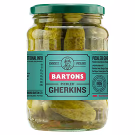 Bartons Pickles is one of England's oldest family-run pickle manufacturers, established in 1905 by Edmund Barton and his wife Lydia in St Helens, Merseyside. What began as a backyard operation selling pickles from hand carts through cobbled streets has grown into a fourth-generation family business still crafting quality pickles today. The Bartons range includes Traditional Pickled Onions in malt vinegar - a British favourite alongside fish and chips or in a ploughman's lunch - as well as crisp silverskin onions perfect for cocktails and parties, sliced pickled beetroot, and crunchy gherkins. Bartons combines traditional pickling methods with quality vegetables and spices for authentic taste. Compare Bartons Pickles prices across UK supermarkets with Grocefully. Whether you're stocking up for a chippy tea or preparing a classic ploughman's, find the best deals at Aldi, Iceland, Wilko, and other retailers on this heritage British brand.
