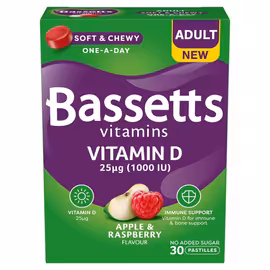 Bassetts Vitamins is a British vitamin brand manufactured by Ernest Jackson & Co. Ltd in Crediton, Devon. Known for their soft and chewy vitamin pastilles, Bassetts has become a household name for making vitamin supplementation enjoyable for the whole family. The vibrant, fruity gummies offer a tasty alternative to traditional tablets and capsules. The Bassetts range covers every life stage, from toddlers to teenagers and adults to over-50s. Children's multivitamins are available in age-appropriate formulations: 3-6 years in Strawberry flavour, 7-11 years in Raspberry and Tropical flavours, and 12-18 years in Summer Berries with added Omega-3 or Evening Primrose Oil. This targeted approach ensures children receive appropriate nutrient levels for their developmental stage. Since launching their first adult product in 2015, Bassetts has expanded to include Adult Multivitamins in Raspberry & Pomegranate flavour, plus specialist formulas for Men, Women, Pregnancy, and Over-50s. All products feature no added sugar and use natural flavours and colours, though they contain bovine gelatine and are not suitable for vegetarians. UK supermarkets stock the Bassetts Vitamins range including children's multivitamins for various age groups and adult formulations. Available at Asda, Morrisons, Tesco, and Boots, comparing prices helps families find the best value on these popular British vitamin gummies.
