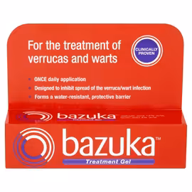 Bazuka is the UK's leading brand for wart and verruca treatment, offering effective over-the-counter solutions that allow you to treat these common skin conditions at home. Trusted by pharmacists and recommended for decades, Bazuka provides clinically proven formulations that help break down wart and verruca tissue while the body's immune system clears the underlying viral infection. The core Bazuka product line features their Treatment Gel and Extra Strength Treatment Gel, both containing salicylic acid as the active ingredient. This proven ingredient works by softening and gradually breaking down the hard, excess skin of warts and verrucas, allowing healthy skin to replace the affected tissue over time. The gel formulation dries to form a water-resistant protective barrier, making it practical for everyday use. The Extra Strength formula contains a higher concentration of salicylic acid for more stubborn warts and verrucas that haven't responded to regular strength treatments. Both products are easy to apply precisely to the affected area, minimising contact with surrounding healthy skin. For those seeking faster results, Bazuka Sub Zero offers cryotherapy treatment at home. This freezing method, similar to treatments used by medical professionals, works by freezing the wart or verruca, causing the affected cells to die and eventually fall off. Sub Zero is particularly useful for those who prefer not to use daily application treatments or want quicker visible results. Grocefully helps you find the best prices on Bazuka wart and verruca treatments across UK supermarkets including Ocado and Sainsbury's, making effective treatment accessible and affordable.
