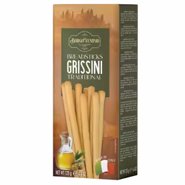 Borgo Venusio is an Italian speciality food brand offering authentic grissini breadsticks to UK consumers. The brand specialises in traditional Italian bakery products, bringing the crisp, golden breadsticks that have been a staple of Italian dining tables for centuries. Manufactured in Italy using time-honoured recipes, Borgo Venusio maintains the authentic character that makes grissini such a beloved accompaniment. The Borgo Venusio Traditional Grissini are crafted using quality ingredients including wheat flour, a generous 7% olive oil, sunflower oil, sea salt, and yeast. The use of olive oil—a hallmark of authentic Italian baking—gives these breadsticks their characteristic flavour and satisfying crunch. Each 125g box delivers perfectly golden breadsticks ideal for entertaining, snacking, or serving alongside Italian antipasti. Grissini, or Italian breadsticks, originated in Turin during the 17th century and have remained virtually unchanged in their basic form ever since. These slender, elongated bread sticks are traditionally served before meals as part of an Italian aperitivo, alongside cured meats, cheeses, and olives. Their light, crispy texture makes them perfect for dipping into olive oil, tapenade, or hummus, while their neutral flavour complements rather than overwhelms accompaniments. UK shoppers can find Borgo Venusio Traditional Grissini at Iceland and Lidl, typically priced around £1.00 for a 125g box—excellent value for authentic Italian breadsticks. The convenient box packaging keeps them fresh and crisp, ready to elevate any gathering or casual dining occasion with genuine Italian style.