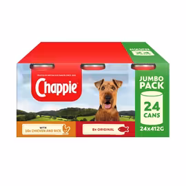 Chappie is one of Britain's oldest and most trusted dog food brands, with a heritage stretching back to 1935. For nearly 90 years, Chappie has been a vet-recommended favourite in UK homes, known for delivering reliable, nutritious meals that are gentle on sensitive stomachs. What sets Chappie apart is its focus on easy digestibility. The recipes exclude common allergens like wheat, eggs, soya, dairy, and red meat, instead using white fish as the primary protein source - a low-fat option that's less likely to trigger sensitivities. The unique balanced formula contains dietary fibres to support healthy digestion. The Chappie range includes wet food tins in Original and Chicken & Rice flavours, available in convenient multipacks. All products are 100% complete and balanced, developed with veterinary input, and free from artificial colours and flavours. Chappie remains popular for its gentle ingredients, reasonable pricing, and reliability - perfect for dogs with sensitive digestion. With Grocefully, compare Chappie prices across UK supermarkets and pet stores to keep your furry friend well-fed at the best value.