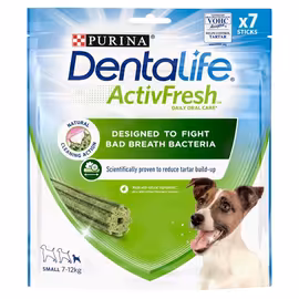 Purina Dentalife is a range of innovative dental dog treats developed by Purina's pet nutrition experts. These daily dental chews are scientifically proven to reduce tartar build-up over 28 days, helping to maintain your dog's oral health through a natural cleaning action rather than simply masking problems. The secret to Dentalife's effectiveness lies in its unique chewy, porous texture with distinct ridges that massage gums whilst the chewing action helps scrub teeth - including those hard-to-reach back teeth most vulnerable to plaque and tartar build-up. The extended chewing time ensures thorough cleaning with every treat. Dentalife uses natural ingredients including honey and spirulina to fight bad breath at its source by neutralising odour-causing bacteria rather than just covering up the smell. The treats are low in fat, containing less than 10% of a dog's recommended daily calorie intake, making them suitable for daily use without contributing to weight gain. The range caters to different dog sizes: Small Dog treats for 7-12kg dogs, Medium Dog treats for 12-25kg dogs, and Large Dog treats for bigger breeds. Each size is formulated with appropriate stick dimensions for safe chewing. The products contain no added sugar, artificial flavourings or colourants. Compare Purina Dentalife prices across Tesco, Sainsbury's, Pets at Home, Amazon and other UK retailers on Grocefully to find the best deals on dental dog treats.
