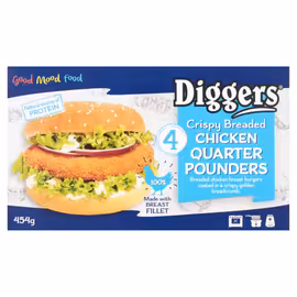 Diggers Foods is an Irish frozen food brand bringing great taste to meal times every day. Known for their range of chicken products with unique delicious coatings and 100% Irish beef burgers, Diggers offers quality frozen foods for everyday meals and party occasions. The chicken range includes Crispy Breaded Chicken Quarter Pounders, Southern Fried Chicken Quarter Pounders, Soy Ginger & Lime Crispy Shredded Chicken, Salt & Chilli Chunks, Breaded Chicken Goujons, Southern Fried Chicken Goujons, Chicken Balls, Hot & Spicy Chicken Goujons, and Hot & Spicy Chicken Wings. Their beef burger range features Irish Premium 99% Beef Burgers alongside turkey options. Diggers also provides a tasty range of party food for all occasions, making them a go-to brand for entertaining and family gatherings. Their products deliver restaurant-style flavours at home with convenient frozen formats that are easy to prepare. Diggers products are available in the freezer section at Tesco, SuperValu, and supermarkets nationwide. Grocefully helps you compare prices across UK supermarkets to find the best deals on frozen chicken and burger products.