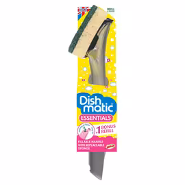 Dishmatic is the world's #1 dispensing fillable and refillable washing up tool, designed and manufactured in the UK. Described as "stunningly simple and fantastically effective," Dishmatic is an essential dishwashing aid loved by everyone who uses it. The innovative system works in three simple steps: FILL your Dishmatic with your favourite washing up liquid, DISPENSE automatically through the brush head as you clean, and REPLACE the head when worn with interchangeable Dishmatic refills. Dishmatic leads in sustainability, with their Eco Dish Brush made from 98-99% recycled plastic and featuring antibacterial bristles to prevent bacterial growth. The angled bristles access hard-to-reach areas, making it ideal for all general purpose washing up and cleaning tasks. Two refill types are available: green for general purpose cleaning and white non-scratch for delicate surfaces. All Dishmatic refills are interchangeable with any Dishmatic brush handle. Available at major UK retailers including Tesco (Big Job Dish Brush from £2.95), Poundland, Amazon UK, and the official Dishmatic shop. Dishmatic protects hands, dispenses liquid soap efficiently, and makes everyday dishwashing easier.