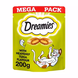 Dreamies is the UK's number one selling cat treat brand, owned by Mars Petcare. These irresistible treats feature a unique combination of a crunchy outer shell with a soft, creamy filling that cats find absolutely irresistible. Backed by over 60 years of pet nutrition research from the Waltham Petcare Science Institute, Dreamies are scientifically formulated to delight feline taste buds while containing essential vitamins and minerals. The Dreamies range spans eight delicious flavours: Chicken, Beef, Duck, Salmon, Cheese, Turkey, Tuna and Catnip. Each crunchy square contains only 2 calories, making them perfect for training, rewarding good behaviour, or simply showing your cat some love. Products come in handy resealable pouches to maintain freshness, with larger Mega Tub options available for multi-cat households. Beyond the Original range, Dreamies offers Mix treats combining two flavours in one, and Shake Ups for variety. The Dreamies Plus range addresses specific health needs: Anti-Hairball (enriched with soluble fibre), Skin & Coat (with omega fatty acids), and Vitamins & Omega-3 (immune support). All products contain no artificial flavours. Mars Petcare serves almost half a billion pets worldwide through iconic brands including Whiskas, Pedigree, Sheba, and Dreamies—all driven by their purpose of creating "A Better World for Pets." Compare Dreamies prices across Tesco, Sainsbury's, Asda and other UK supermarkets with Grocefully.