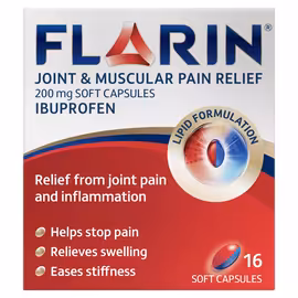 Flarin is an innovative UK pain relief brand manufactured by Infirst Ltd, specialising in ibuprofen soft capsules with patented Lipid Lock technology. This unique lipid formulation encases ibuprofen in a protective layer, allowing it to pass through the stomach and be absorbed in the small intestine for effective pain relief. The brand focuses specifically on joint and muscular pain relief, targeting conditions such as rheumatic pain, back pain, and non-serious arthritic conditions. Clinical studies have demonstrated that Flarin at 1200mg/day is as effective as double-dose standard ibuprofen at 2400mg/day for relieving flaring knee pain, making it the only over-the-counter ibuprofen clinically proven for joint pain flare-ups. Flarin 200mg soft capsules are available from UK pharmacies and major supermarkets including Tesco, Morrisons, and online retailers. The product is designed for adults and children over 12 who suffer from joint stiffness, muscular aches, and inflammatory pain. Grocefully helps you compare Flarin prices across UK supermarkets, ensuring you find the best value on this clinically-proven joint pain relief medication with its innovative lipid-protected formula.