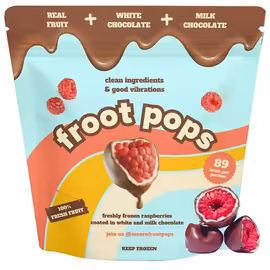 Froot Pops is a female-owned independent British business creating delicious frozen fruit snacks coated in premium Fairtrade Belgian chocolate. Made in their kitchen in East London, each Froot Pop features plump, freshly frozen whole berries double-dipped in smooth chocolate for the perfect bite. The brand was born when the founder created her signature white and milk chocolate raspberries in homage to her sister's favourite snack - and the recipe was so popular with family and friends that she brought it to market. The range includes frozen strawberries, raspberries and cherries coated in various combinations of white, milk and dark chocolate. All products are gluten-free, vegetarian-friendly, and made without artificial colours, flavours or preservatives. The use of high-quality Fairtrade Belgian chocolate ensures both exceptional taste and ethical sourcing. Compare Froot Pops prices at Grocefully to find the best deals across UK supermarkets like Ocado and Morrisons on these indulgent frozen fruit treats.