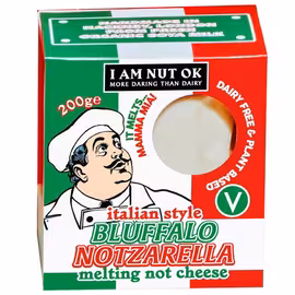 I Am Nut OK is an award-winning London-based vegan cheese brand founded in 2017 by American-Italian couple Angela and Nivi. What started as a passion project at a little market stall in Hackney has grown into one of the UK's leading artisan plant-based cheese producers. The brand was born from Angela's desire to create healthy, delicious cheese alternatives for Nivi, an Italian who struggled to give up cheese when going vegan. Everything is lovingly handcrafted in Hackney by a small team of skilled plant-based cheesemakers using cashews fermented with dairy-free live cultures to create authentic tang and umami. Their creative product range includes Fetamorphosis (cultured cashew feta alternative), Oh Grate! (vegan parmesan), and Bluffalo Notzarella (soy-based mozzarella alternative). Other varieties include smoky charcoal wedges and black pepper logs, all with playful names reflecting the brand's bold, creative identity. I Am Nut OK has achieved remarkable growth, with 50% increase since 2021. The brand is stocked at Ocado, Aldi, Selfridges, Fortnum & Mason, Whole Foods, and Planet Organic. At Grocefully, you can compare prices on I Am Nut OK vegan cheeses across UK retailers.