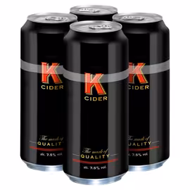 K Cider is a premium strong apple cider manufactured and distributed by C&C Group plc, one of the UK's leading drinks companies. Recognisable by its distinctive black cans with the iconic scarlet K logo, this full-bodied cider is crafted from a unique blend of English apples, containing 70% apple juice fermented to its natural alcoholic strength. With an ABV of 7.5%, K Cider sits firmly in the strong cider category, offering a robust drinking experience. The brand has a heritage of producing high-strength natural cider, though the ABV has been gradually reduced from its original 8.4% over the years. Produced at C&C Brands' facility in Glasgow, K Cider uses the slogan "The Mark of Quality" to emphasise its commitment to authentic cider production. K Cider occupies a value-oriented position in the UK cider market, offering affordable pricing for budget-conscious consumers who appreciate a stronger cider. The 500ml can format is the standard offering, with multipacks of 4 or 24 cans commonly available at supermarkets and off-licences across the UK. Compare K Cider prices at Grocefully to find the best deals at UK supermarkets including Lidl. Please drink responsibly and be aware of the higher alcohol content compared to standard ciders.