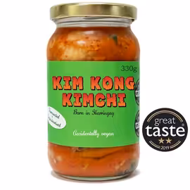 Kim Kong Kimchi is an award-winning London-based brand creating naturally fermented, unpasteurised vegan kimchi. Founded by James (Jim) in 2016, the brand set out to create authentic-tasting kimchi using plant-based ingredients, earning recognition including two stars at the Great Taste Awards 2019 and another in 2023. The kimchi follows traditional baechu-style preparation with hand-cut Chinese leaf cabbage, carrots, and spring onions. To achieve authentic flavour and deep colour without fish products, Kim Kong sources sweet, smoky gochugaru chilli flakes and uses aged aka miso for rich umami depth. Unlike many commercial kimchis jarred after just 3-4 days, Kim Kong ferments for much longer to develop a richer, more complex flavour profile. What makes Kim Kong distinctive is that it remains raw and unpasteurised, unlike most imported kimchi. This means the fermentation continues after purchase, with the kimchi slowly ripening and becoming more sour over time. The product is certified vegan, gluten-free (less than 10ppm), and low sugar (under 5g per 100g), making it suitable for various dietary requirements. Compare Kim Kong Kimchi prices at Grocefully to find the best deals at UK supermarkets including Tesco. Also available at Whole Foods, Planet Organic, Ocado, and independent health food stores, primarily in London.