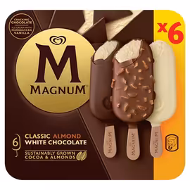 Magnum is the UK's number one ice cream brand, renowned for its signature cracking Belgian chocolate coating and velvety smooth vanilla ice cream. Launched in 1989, Magnum revolutionised the ice cream market by creating the first premium handheld ice cream designed specifically for adults seeking indulgence and pleasure. The brand's origins trace back to Denmark in the late 1980s, where Mogens Vigh-Larsen developed the concept at Frisko. The breakthrough came when Belgian bio-engineer Geert Debevere solved the chocolate coating challenge by adding extra milk fat, creating the signature crack at first bite. Using Madagascar vanilla and chocolate crafted by Belgian pioneers, Magnum quickly expanded across Europe and worldwide. Today's UK range spans over 15 flavours including Classic, Almond, White Chocolate, Double Chocolate, and the innovative Vegan range launched in 2018. The 2024 mood-inspired Euphoria Pink Lemonade—featuring popping candy—became the UK's top new ice cream product launch. The Vegan Chill Blueberry Cookie offers plant-based indulgence without compromise. New Magnum Bon Bons provide bite-sized options in White Chocolate & Cookies, Gold Caramel Billionaire and Salted Caramel & Almond flavours. Following Unilever's December 2025 demerger, Magnum is now part of The Magnum Ice Cream Company (TMICC)—the world's largest ice cream company with €7.9 billion revenue and 21% market share. TMICC has committed £50 million to UK operations, boosting capacity by 25%. Compare Magnum prices across Tesco, Sainsbury's, Asda, Morrisons and more to find the best deals on your favourite indulgent ice cream.