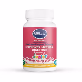 Milkaid is a UK lactase enzyme brand manufactured by Crosscare Ltd in Anglesey, Wales, helping the estimated 4 million lactose intolerant people in the UK enjoy dairy products without discomfort. The products contain lactase enzyme extracted from natural yeasts, breaking down complex milk sugar lactose into easily digestible glucose and galactose. The range includes chewable Tablets (raspberry flavoured, 3000 ALU per tablet), Junior Tablets (strawberry flavoured, for children 3+), Drops (add to milk to reduce lactose 70-96%), and MAX Capsules (9000 ALU for more pronounced symptoms). All products are gluten-free, yeast-free, and contain no artificial flavours. Milkaid Tablets are convenient for eating out - simply chew before consuming dairy. Milkaid Drops work differently - add 3 drops per 500ml milk, refrigerate 24 hours for 70% lactose reduction, or 10 drops for 96% reduction. The product was voted Highly Recommended in Pharmacy Product of the Year 2024 (Health & Wellbeing). Milkaid is a food supplement, not a medicine, and is recommended by NHS Choices for individuals who cannot naturally break down lactose. Available at pharmacies, Tesco, Amazon UK, and health stores nationwide.