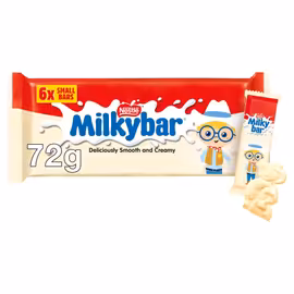 Milkybar is the UK's number one white chocolate brand, produced by Nestlé since 1936. As the first white chocolate brand ever created, Milkybar has become synonymous with smooth, creamy white chocolate treats loved by generations of British families. The Milkybar range includes classic bars, the iconic Milkybar Buttons (with over 1.9 billion sold annually in the UK), Giant Buttons sharing bags, and Kid Bars. Seasonal offerings include popular Easter eggs, Mini Eggs, and Christmas advent calendars featuring festive white chocolate shapes. All Milkybar products are made without artificial colours, flavours, or preservatives and are suitable for vegetarians. Since 2015, Milkybar has used 100% Rainforest Alliance Certified cocoa through the Nestlé Cocoa Plan, demonstrating commitment to sustainable sourcing. Milkybar is widely available across UK supermarkets including Tesco, Sainsbury's, Asda, Morrisons, and Ocado. Compare prices on Grocefully to find the best deals on your favourite white chocolate treats.