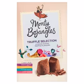 Monty Bojangles is a British luxury chocolate brand famous for their Belgian-style cocoa dusted truffles with playful, imaginative names. Founded in the UK, the brand creates indulgent truffles in distinctive quirky-named varieties like 'Choccy Scoffy' and 'Taste Adventures'. The range includes classic truffle selections, vegan options featuring cocoa nib-infused recipes, nougat assortments, and premium chocolate bars. Each truffle is generously coated in cocoa powder for that authentic Belgian truffle experience. The beautifully designed packaging makes Monty Bojangles perfect for gifting or self-indulgent treating. Available in UK supermarkets at accessible prices for premium chocolate.