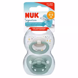 NUK is a trusted German baby brand with over 60 years of experience developing products that support healthy infant development. Founded in 1956, NUK has become synonymous with quality baby care, particularly renowned for their orthodontically-designed soothers and feeding equipment. The NUK dummy range is designed around their pioneering orthodontic teat shape, which mimics the natural form of a mother's nipple during breastfeeding. This asymmetric design helps support healthy oral development while providing comfort and soothing for babies. The characteristic NUK shape has been refined over decades in consultation with dentists and orthodontists. The Star range offers NUK's core dummy design with its proven orthodontic benefits. The Star Night variants feature glow-in-the-dark elements, making them easy to locate during nighttime settling without fully waking baby or parent. The Signature range delivers premium styling while maintaining the same developmental benefits. All NUK soothers feature air systems in the shield to prevent skin irritation and are available in different sizes to suit babies from birth through toddlerhood. Materials include medical-grade silicone and natural latex options, all rigorously tested to exceed safety standards. Available at Morrisons and other UK retailers, NUK products bring German engineering to baby care. Use Grocefully to compare NUK prices and choose the right soothers for your baby.