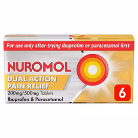 Nuromol is a dual-action pain relief medication combining two active ingredients - ibuprofen (200mg) and paracetamol (500mg) - in a single tablet for enhanced pain management. Made by Reckitt, the makers of Nurofen, Nuromol is designed for adults seeking more effective relief from moderate pain including headaches, migraines, back pain, period pain, dental pain, and cold and flu symptoms. The combination works through different mechanisms: ibuprofen reduces inflammation whilst paracetamol blocks pain signals, providing superior relief compared to either ingredient alone. Clinical studies show this dual-action approach delivers better pain relief than taking ibuprofen or paracetamol separately. Available in 6, 12, and 16 tablet packs at UK supermarkets and pharmacies. Always read the label and follow dosage instructions carefully. Compare Nuromol prices at Grocefully to find the best deals on dual-action pain relief across UK retailers.