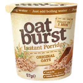 Oatburst is a UK instant porridge brand manufactured by Symington's Ltd in Leeds, offering convenient on-the-go breakfast solutions that keep you satisfied until lunch. Each 57g pot is ready in just one minute - simply add boiling water for a creamy, wholesome porridge wherever you are. The range includes Original Oats (classic creamy sweetened porridge), Apple & Blueberry (fruity twist on the traditional favourite), and Golden Syrup (rich, indulgent flavour for sweet-tooth breakfast lovers). Made with oat flakes and skimmed milk powder, Oatburst contains no artificial colours or preservatives, delivering a low-fat breakfast option. Perfect for busy mornings, office desks, or travel, Oatburst porridge pots eliminate the need for measuring or mess. The brand is widely available at value retailers including Poundland, making nutritious breakfast accessible and affordable. Whether you're rushing to work or need a warming mid-morning snack, Oatburst delivers satisfying oat goodness in just 60 seconds.