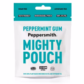 Peppersmith is a pioneering British brand creating dental-friendly chewing gum and mints made with 100% xylitol instead of sugar. Founded in 2010 by friends Dan Shrimpton and Mike Stevens, Peppersmith was created after learning about xylitol's proven benefits for dental health - it can help prevent tooth decay by inhibiting bacteria that cause cavities. Unlike regular gum containing sugar or synthetic sweeteners, Peppersmith uses only xylitol derived from sustainably sourced birch trees. The range includes gum in Spearmint, Peppermint, English Peppermint, and Lemon flavours, plus fresh mints. Peppersmith is plastic-free, using natural chicle gum base, and comes in compostable packaging. Recommended by dentists and approved by the Oral Health Foundation, Peppersmith offers guilt-free chewing that's actually good for your teeth. Compare prices across UK health food stores and supermarkets.