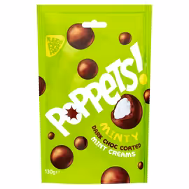 Poppets are a beloved British confectionery brand known for bite-sized chocolate-coated sweets that have been a cinema and theatre favourite for generations. Originally created by Paynes of York, one of Britain's historic confectionery makers, Poppets have become an iconic part of British sweet culture. The range features several classic varieties including Toffee Poppets with milk chocolate coated chewy toffee centres, and Minty Poppets with dark chocolate coated mint cream centres. Other popular flavours include Raisin Poppets and Peanut Poppets, each offering the signature combination of quality chocolate coating around a delicious centre. Now owned by Valeo Foods following their acquisition of Big Bear Confectionery, Poppets continue to be manufactured to the same high standards that made them famous. The brand is particularly associated with movie-going experiences, with the distinctive boxes being a staple at cinema concession stands across the UK. Available in both traditional boxes and modern pouch formats, Poppets offer convenient sharing sizes perfect for family movie nights at home or trips to the cinema. The combination of quality chocolate and satisfying centres has made Poppets a nostalgic treat for adults who remember them from childhood while continuing to win new fans among younger generations of sweet lovers.