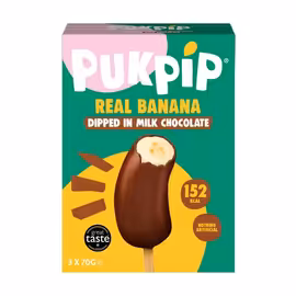 Pukpip is an innovative UK frozen snack brand specialising in chocolate-dipped frozen bananas, offering a healthier, more sustainable alternative to ice cream. Founded by Zara Godfrey based on cherished childhood memories of her mum's homemade chocolate frozen bananas, the brand launched in the UK in January 2023. The brand name cleverly combines "pukka" (meaning good or genuine) with "pip" (from fruit pips and seeds), reflecting their commitment to authentic, natural ingredients. Pukpip is on a mission to reduce food waste by using perfectly imperfect "wonky" bananas - fruit rejected from export simply because it doesn't meet cosmetic standards for size, shape or skin markings. The range includes Real Banana dipped in Milk Chocolate (Great Taste Award 2022 winner), Dark Chocolate (vegan certified), and Banana Bites in milk chocolate, dark chocolate and peanut butter coatings. Each banana contains just 152-161 calories, packed with natural fibre and potassium with zero artificial ingredients - making them a guilt-free indulgent treat. Pukpip is connected to the US brand Diana's and is distributed by Ecuador-based Semvra Group. Grocefully helps you compare Pukpip prices across UK retailers including health food stores and supermarkets.
