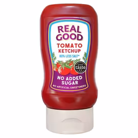 Real Good Ketchup is an award-winning British brand specialising in no added sugar, reduced-salt condiments. Founded as a female-owned small business in Hampshire, Real Good has become a pioneer in health-conscious food, serving their ketchup to over 50,000 school children and college students across the UK. The Real Good formula sets a new standard for healthier ketchup. Made with 88% sun-kissed Mediterranean tomatoes and containing over 80% less salt than regular ketchups, it uses natural sweeteners including xylitol and steviol glycosides instead of sugar or high fructose corn syrup. The result is a low GI product suitable for Type 2 diabetics while maintaining the rich, tangy flavour that ketchup lovers expect. Real Good's commitment to quality has earned impressive accolades, including the Great Taste 2024 award and Best Children's Food Product 2021 at the World Food Innovation Awards. The brand holds the distinction of being the only ketchup awarded 5 Stars in The Times Condiment Taste Test. Their products are gluten-free, nut-free, Non-GMO, vegan, and free from 14 listed allergens. Available at Ocado, Wholefoods Market, Amazon, and selected UK supermarkets, Real Good Ketchup comes in 100% BPA-free recyclable bottles. Compare Real Good Ketchup prices on Grocefully to discover this socially responsible health food brand that proves reduced sugar doesn't mean reduced taste.