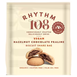 Rhythm 108 crafts indulgent vegan Swiss chocolate bars and biscuits in their bakery in the foothills of the Swiss Alps. Inspired by the unhurried pace and regional craftsmanship of the Swiss landscape, their expert Chocolatiers and Pâtissiers hand-make every treat. Each Rhythm 108 chocolate bar features a unique praline centre coated in velvety smooth Swiss chocolate. They replace traditional flour, butter, eggs, and palm oil with hearty nuts, oats, and the finest cocoa - resulting in naturally vegan, gluten-free treats that don't compromise on taste. Popular varieties include the Creamy Coconut Bar with fragrant coconut centre, the Hazelnut Praline Bar flecked with crunchy hazelnut pieces, and the zesty Chocolate Orange. All products are organic, free from refined sugars, and made without palm oil. Rhythm 108 sources chocolate exclusively from co-operatives and family-run farms, ensuring ethical practices throughout their supply chain. Their sustainable packaging reflects their commitment to environmental responsibility. Grocefully helps you compare Rhythm 108 prices across UK retailers including Amazon, health food stores, and specialty grocers to find the best deals on premium vegan Swiss chocolate.