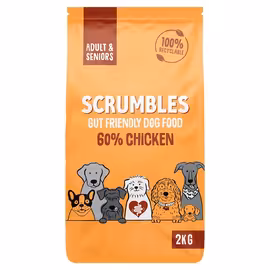 Scrumbles is a British pet food brand founded in 2018 by husband and wife team Aneisha Soobroyen and Jack Walker, inspired by their own pets' sensitive tummies. After their cat Boo suffered digestive issues, Aneisha and Jack quit their corporate jobs and spent 18 months developing recipes in their Croydon kitchen before launching Scrumbles. The brand focuses on gut health, featuring natural prebiotics (like chicory and slippery elm), probiotics (Enterococcus Faecium with over 1 billion live bacteria per kilo), and postbiotics across their range. All recipes are hypoallergenic, avoiding soy, gluten, dairy, egg, and red meat. Scrumbles uses easy-to-digest proteins—free-run poultry and fish from human food supply chains—with up to 77% quality meat or fish per recipe. Scrumbles gained national attention on Dragon's Den in August 2019, where Aneisha and Jack famously turned down an offer from Deborah Meaden. Since then, the company has grown from packing orders in their kitchen to generating over £10 million in annual sales. In March 2023, Scrumbles secured a £6 million investment to fund further expansion. The product range includes probiotic-packed dry food for dogs and cats, grain-free wet food with 65% single-source meat, guilt-free treats, dental chews, and specialist puppy and kitten food. All Scrumbles products are manufactured in the UK. Key retailers include Tesco, Sainsbury's, Waitrose, Asda, Pets at Home, and Amazon. Compare Scrumbles dog food and cat food prices across UK supermarkets with Grocefully.
