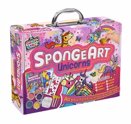 Sponge Art is a popular children's arts and crafts range from Bookoli (Curious Universe), offering complete sponge painting kits packaged in convenient carry cases. These comprehensive kits provide everything children need to create colourful artworks using the simple, fun technique of sponge dabbing - perfect for developing creativity and fine motor skills in young artists. The Sponge Art Unicorns Carry Case is a standout product, containing ten art cards to decorate, rainbow paints, sponge dabbers, and handy stencils. Children simply dip the sponge dabbers in paint, apply them through the stencils, and watch as beautiful unicorn artwork comes to life. The easy-to-follow instructions make it simple for kids aged 5 and up to create stunning masterpieces. Packaged in bright, sturdy carry cases, Sponge Art kits are designed for on-the-go creativity. Whether at home, on car journeys, visiting friends, or on holiday, children can easily take their art supplies with them. The self-contained format keeps all materials organised and makes cleanup easy - a bonus for parents! Available at UK retailers including ASDA and Hobbycraft (priced around £5), Sponge Art kits make excellent gifts for creative children, party bags, or rainy day activities. The educational nature of the kits helps develop hand-eye coordination and artistic expression. Compare Sponge Art prices at Grocefully to find the best deals on these popular children's craft kits.