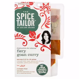 The Spice Tailor is an award-winning British Indian food brand founded in July 2011 by celebrity chef and cookery writer Anjum Anand and her husband Adarsh Sethia. The brand was created to bring authentic, restaurant-quality Indian cooking to UK kitchens, dispelling the myth that Indian cuisine is unhealthy or difficult to prepare. Anjum Anand, born in London and trained in European business administration, grew up frustrated that supermarket Indian products didn't reflect the real flavours she experienced at home. The Spice Tailor was her solution: easy-to-use meal kits that taste homemade, with no artificial colours, flavours, preservatives, or fillers. The curry kits are cooked in small batches using traditional methods that layer ingredients step-by-step to build authentic depth of flavour. Each kit provides a simple 3-step process that enables anyone, from kitchen novice to proficient cook, to achieve delicious results. Most kits include a whole dried chilli that can be left out for mild dishes or ground up for extra heat. The Indian curry kit range includes beloved classics like Butter Chicken, Original Tikka Masala, and Rustic Rogan Josh, alongside regional specialities like Keralan Coconut Curry, Fiery Goan Curry, Southern Pepper Curry, and Spicy Bengali Jalfrezi. The wider range includes biryani kits, tandoori marinades, daals, naans, chutneys, and crispy poppadoms. In October 2022, The Spice Tailor was acquired by Premier Foods, the company behind Bisto, Oxo, and Mr Kipling. The brand continues to operate under Premier Foods ownership, maintaining its commitment to authentic recipes. The Spice Tailor is available at UK supermarkets including Tesco, Sainsbury's, Waitrose, Morrisons, and Ocado. Compare prices across retailers with Grocefully.