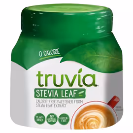 Truvia is a calorie-free sweetener made from stevia leaf extract, a plant-based sweetener that is 200 times sweeter than sugar. The product contains just three simple ingredients: stevia leaf extract (steviol glycosides), erythritol for bulk and texture, and natural flavourings. Erythritol is a sugar alcohol that occurs naturally in fruits like grapes and pears. Truvia is free from artificial sweeteners, colours, and preservatives, and is suitable for vegans, vegetarians, and those on gluten-free diets. Just 1/3 teaspoon provides the same sweetness as one teaspoon of sugar. The UK range includes calorie-free sweetener tablets for drinks, spoonable jars for everyday use, and Truvia for Baking alternatives including caster, icing, and brown sugar substitutes. Compare prices on Truvia products at Grocefully to find the best deals.