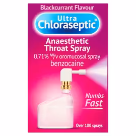 Ultra Chloraseptic is a leading anaesthetic throat spray brand providing fast-acting relief for sore throats. The spray contains benzocaine (0.71% w/v), a local anaesthetic that works by numbing the pain at the site of application, delivering targeted relief directly to the affected area. The brand is owned and marketed by Prestige Brands (UK) Limited, based in Yatton, Somerset, with products manufactured at Pharmasol Limited in Andover, Hampshire. Ultra Chloraseptic has established itself as a trusted over-the-counter remedy found in medicine cabinets across the UK. The innovative swivel head applicator design ensures the anaesthetic spray reaches the throat directly, providing more effective delivery than traditional throat lozenges. This targeted approach means the numbing action begins working immediately upon contact, offering rapid relief when you need it most. Ultra Chloraseptic is available in multiple flavours to suit different preferences: Original Menthol for a classic cooling sensation, Cherry and Blackcurrant for fruity alternatives, and Honey & Lemon for a soothing taste. All variants come in 15ml spray bottles typically priced around £5-6 at UK pharmacies and supermarkets. The product is suitable for adults and children over 6 years old. The recommended usage is one spray every two to three hours, with a maximum of 8 applications per day, for up to 3 consecutive days. As with all medicines, users should read the patient information leaflet and consult a pharmacist if symptoms persist. Ultra Chloraseptic is widely available across the UK at major supermarkets including Tesco, Sainsbury's, ASDA, Morrisons, and Waitrose, as well as pharmacies like Boots, Superdrug, and LloydsPharmacy.