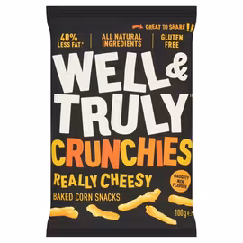Well & Truly is a British healthier snacking brand launched in June 2016, offering delicious alternatives to traditional crisps and confectionery. Based in London, the brand was created to provide great-tasting snacks that don't compromise on health credentials. Their flagship product line - Crunchies - are baked corn snacks containing 40% less fat than average crisps. Made with all-natural ingredients and no added sugar, these gluten-free, vegetarian-friendly snacks come in under 150 calories per serving. Popular flavours include Really Cheesy, Smokey Paprika, Banging BBQ, Sour Cream & Onion, Punchy Pickle, and Sea Salt & Cider Vinegar. Well & Truly has expanded beyond savoury snacks into ethical chocolate, offering oat milk chocolate bars made with 43% single origin cocoa. These vegan-friendly chocolates are ethically and fairly traded, including seasonal options like the Cinnamon Christmas Bar. Originally positioned in free-from aisles, Well & Truly has grown to be stocked across major UK supermarkets including Tesco and Ocado, as well as Amazon. Use Grocefully to compare prices across retailers for healthier snacking options that taste as good as they make you feel.