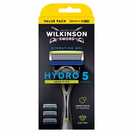 Wilkinson Sword is a historic British brand selling razors and personal care products, founded by Henry Nock in London in 1772. Originally manufacturing guns and swords during the American Revolutionary and Napoleonic Wars, the company later diversified into typewriters, garden shears, scissors, and motorcycles before becoming synonymous with razors. In 1962, Wilkinson Sword revolutionised shaving by introducing stainless steel razor blades, which could be used for a week compared to carbon steel blades that rusted daily. This innovation drove rapid market share gains. The company has changed hands multiple times—from Swedish Match (1986) to Warner-Lambert (1992) to Pfizer (2000) to Energizer (2003). Since 2015, Wilkinson Sword has been part of Edgewell Personal Care, which uses the brand in Europe while Schick is used in other markets. The UK product range includes the premium Hydro system razors and budget-friendly Xtreme 3 disposables. The Hydro 5 features five carbon-coated precision blades with hydrating gel pools enriched with pro-vitamin B5 for sensitive skin protection. The Hydro 3 offers three-blade comfort at a lower price point. All Hydro blades are interchangeable across Hydro razors, lasting approximately 18 shaves. The Xtreme 3 Sensitive features flexible blades with aloe vera lubricating strips—handles now made with 35% recycled plastic. Wilkinson Sword historically manufactured in London (Chelsea and Acton), Cramlington (Northumberland) and Bridgend (Wales, gardening tools). UK razor production moved to Germany in 2000 and the Czech Republic in 2014. Compare Wilkinson Sword razors and blades at Tesco, Sainsbury's, Boots, Superdrug and Asda with Grocefully.