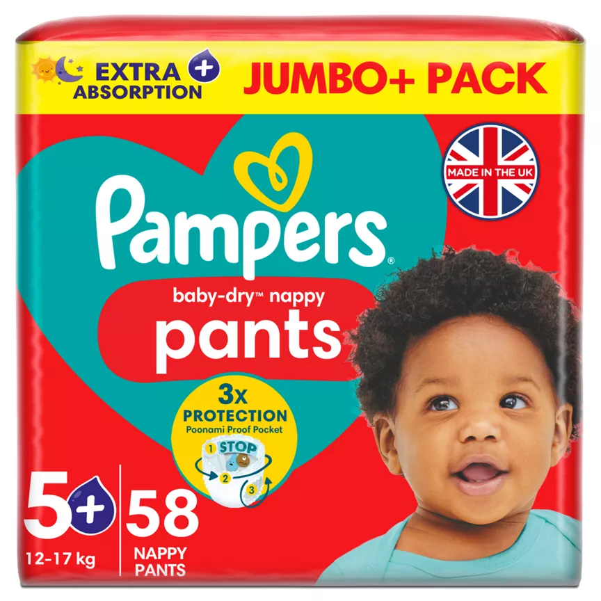 Pampers Baby-Dry Nappy Pants Size 5+, 58 Nappies,12kg-17kg