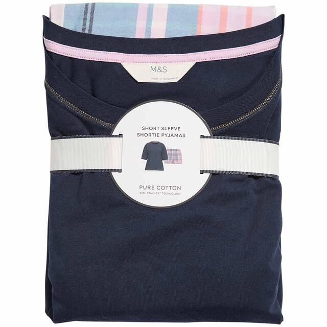 M&S Cotton Top Woven Checked Pyjama Set, 8-18, Navy